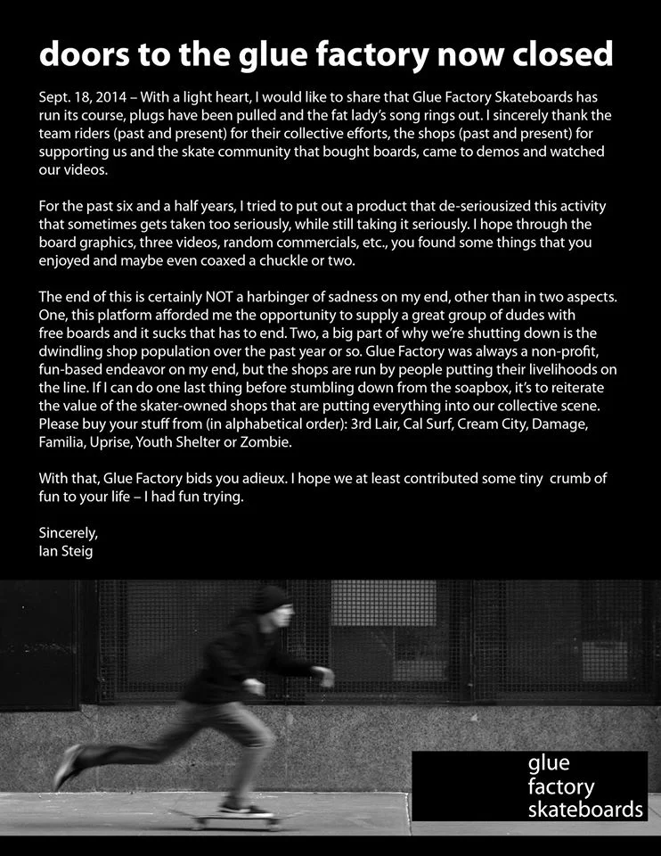 We're sad to report that Glue Factory is no more. On September 18th the Minnesota-based board company issued the press release seen above via Platinum Seagulls. The company was headed up by Dan Jackson, a long time Twin Cities ripper.