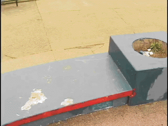 Nollie frontside 180 to fakie 5-0 shove-it at another mainstay of plaza skating.
