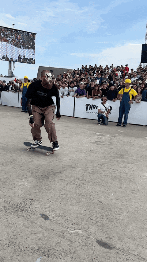 My friends were scattered throughout the arena. Some were in the normal seating area. My publishers were with me in VIP, assiduously documenting the event. The crowd bounced on the wooden bleachers to a hyperpop version of Cher’s “Believe”. With one challenge remaining, I decided to speak to the crowd (afterall, I was a foreign correspondent), mounting the stands as massive fireballs exploded from the top of a Volcano-shaped quarterpipe. “It’s like the WWE,” a young couple from the UK told me. Not skaters themselves, these vacationers had simply wandered into the Dime Glory Challenge. Another skater I spoke to had made the 12-hour drive from Halifax to be here. Clearly enthusiastic, his highlights from the day surprised me. “The DJs,” he said, bobbing his head. Silently, he scratched himself under his mesh top until he looked at me suspiciously and walked away.