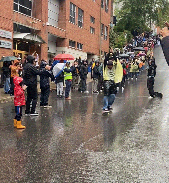Still, skating has a long history with rain, and that afternoon, I was reminded how some of its most mythical tricks were done when the sky came down. Pedro Delfino 50-50’d the flat bar first try, a trick that barely registered against the collective struggle everyone else seemed to have. Mostly, competitors eschewed the flat bar, and chucked flip tricks off the platform at the top instead. Hill bombs ensued. Hometown hero Léon Chapdelaine even added some theatrics by turning switch half way down Avenue Hotel-de-Ville. Generally, though, caution prevailed, as everyone who made it to the bottom of the hill faced the same danger: the following intersection lacked a spotter.