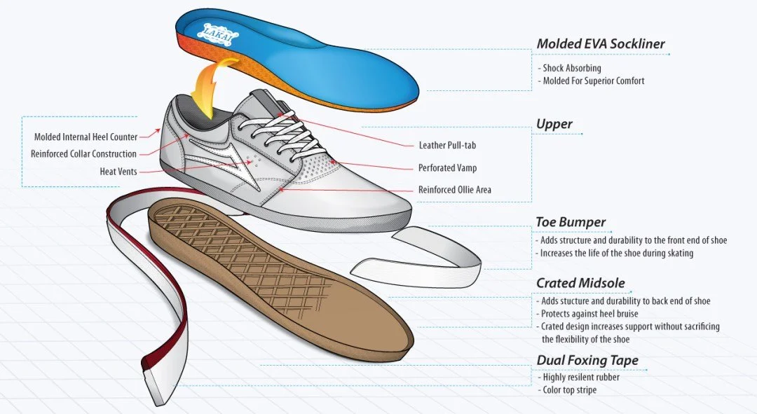 The shoe has double suede in the toe area. A lot of brands will skip that part and just join the toe to the vamp ( vamp is the toe area of the shoe)--but just do a couple kickflips and that thing will open right up. We actually glued the toe cap down so that thing doesn’t go anywhere. The cupsole portion was designed to feel like a vulc up front with plenty of support in the heel.