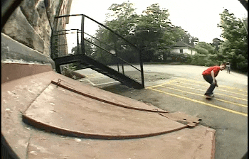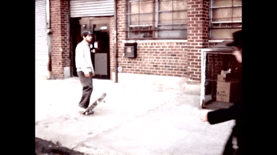 Aaron’s 50-50 shove-it up a bump to bar harkens back to Robbie Gangemi’s backside 50-50 in Zoo York’s Mixtape (1998), which shares additional parallels: it was filmed from behind, with the skater standing up, and the skater having their arms behind their back.
