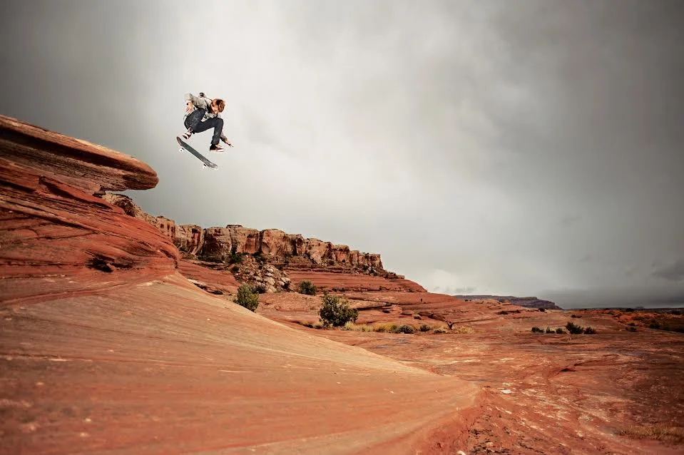 JM: There are so many that bring to mind crazy stories. One that was tough to get was Jaws' kickflip in the intro from Utah. We had just found the "spot" and he was rolling up to it. There was a massive storm coming in and we had been warned not to get caught out there in one. But you know it is when someone is trying a trick: No one wants to stop until the skater either lands it or is too tired to keep trying. So we go rushing ahead. I'm frantically setting up lights and grabbing lenses. He's going for it and getting really close, sticking it every time, when the wind gets up and my light stand goes flying off the rock and smashed the strobe on the ground 10 feet below. We had to grab the gear and run for cover. We managed to get out of there but only by walking next to the van, holding it on the slippery mud road with our hands. It took us hours to get to the main road and he had to go back and land it later.