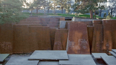 Keller Fountain Park, which the New York Times architecture critic Ada Louise Huxtable described as “the most important urban space since the Renaissance”, was designed by Angela Danadjieva, who before joining Halprin’s office, worked in film art direction. The park encompasses a whole city block across from Portland’s civic auditorium. It is a massive valley carved out of the middle of the city, formed with terraced seating and steps, and with cascading waterfalls that act as a backdrop to dozens of concrete platforms, creates a series of miniature open-air stages. The city once considered decommissioning the fountain due to its high operating costs, but according to The Oregonian, the city’s administrator, “concluded that he would probably be taken out and shot before the public allowed him to shut the water off.”